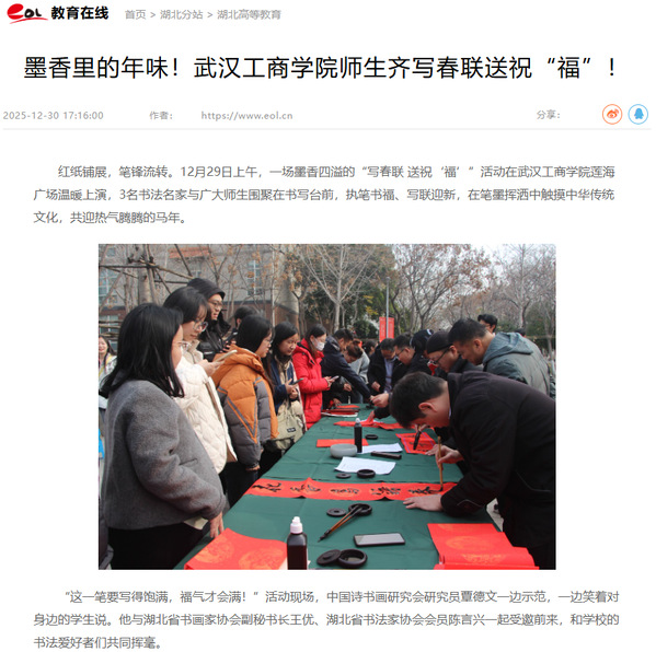 红纸铺展,笔锋流转。12月29日上午,一场墨香四溢的“写春联 送祝‘福’”活动在武汉工商学院莲海广场温暖上演,3名书法名家与广大师生围聚在书写台前,执笔书福、写联迎新,在笔墨挥洒中触摸中华传统文化,共迎热气腾腾的马年。