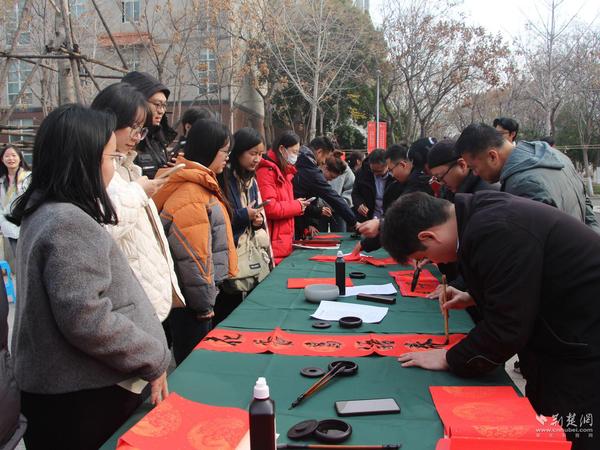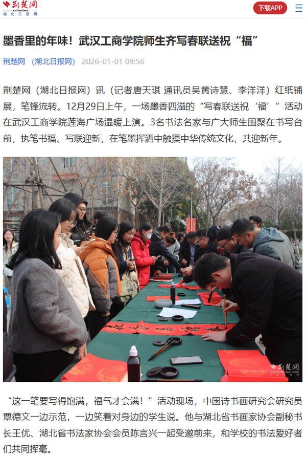 荆楚网(湖北日报网)讯(记者唐天琪 通讯员吴黄诗慧、李洋洋)红纸铺展,笔锋流转。12月29日上午,一场墨香四溢的“写春联送祝‘福’”活动在武汉工商学院莲海广场温暖上演。3名书法名家与广大师生围聚在书写台前,执笔书福、写联迎新,在笔墨挥洒中触摸中华传统文化,共迎新年。