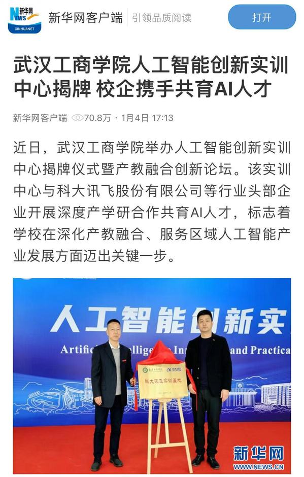 近日,武汉工商学院举办人工智能创新实训中心揭牌仪式暨产教融合创新论坛。该实训中心与科大讯飞股份有限公司等行业头部企业开展深度产学研合作共育AI人才,标志着学校在深化产教融合、服务区域人工智能产业发展方面迈出关键一步。