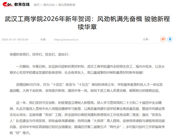一元复始,华章日新。在这辞旧迎新的美好时刻,武汉工商学院谨向全校师生员工、海内外校友,以及长期关心支持学校建设发展的各级领导、社会各界友人,致以最诚挚的问候和最美好的新年祝福!