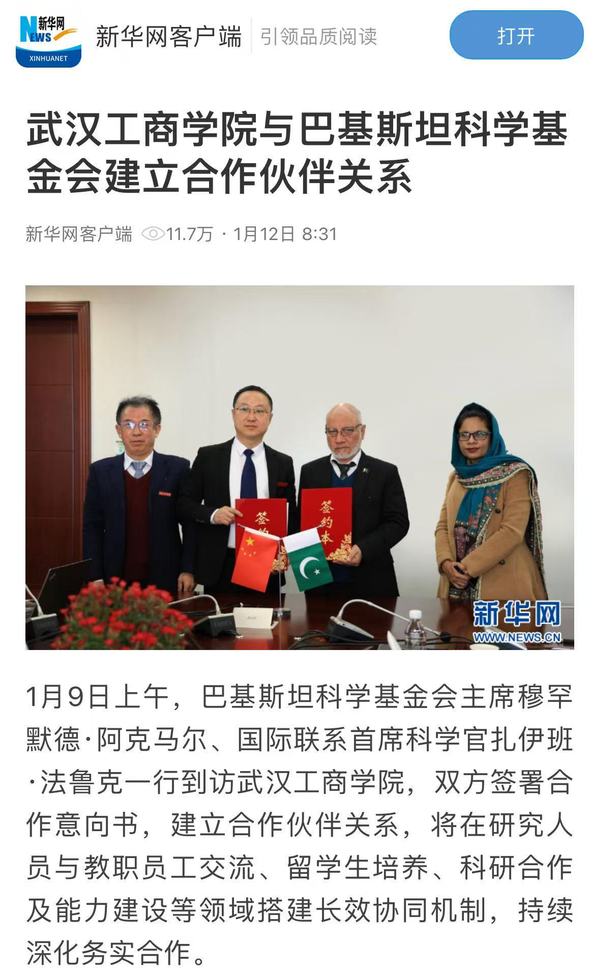 新华网客户端:武汉工商学院与巴基斯坦科学基金会建立合作伙伴关系