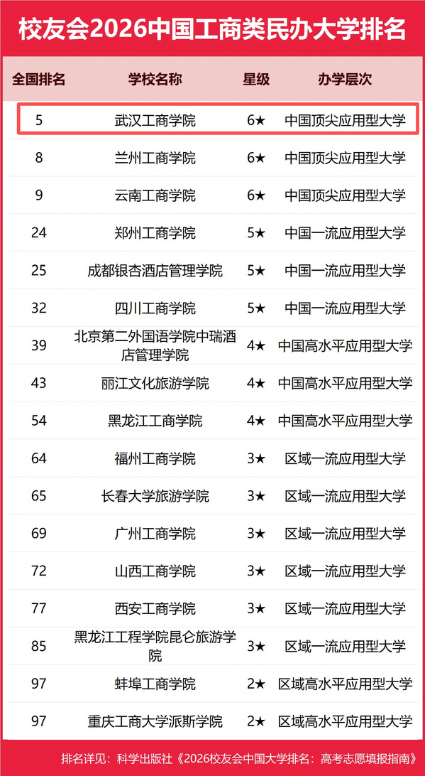 新闻中心讯(记者 孙欢欢)1月12日,艾瑞深校友会网正式发布校友会2026中国大学排名。榜单显示,武汉工商学院在中国工商类民办大学中办学实力最强、办学水平最高、最具竞争力,雄居榜首,这是学校连续第五年登顶该排行榜。此外,学校在中国民办大学排名(Ⅲ类)中位居全国第五,荣膺2026中国六星级民办大学,办学层次为中国顶尖应用型大学。