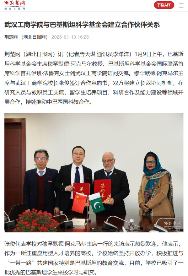 荆楚网(湖北日报网)讯(记者唐天琪 通讯员李洋洋)1月9日上午,巴基斯坦科学基金会主席穆罕默德·阿克马尔教授、巴基斯坦科学基金会国际联系首席科学官扎伊班·法鲁克女士到武汉工商学院访问交流。穆罕默德·阿克马尔主席与武汉工商学院校长张俊签订合作意向书,双方将建立长效协同机制,在研究人员与教职员工交流、留学生培养项目、科研合作及能力建设等领域开展合作,持续推动中巴两国科教合作。
