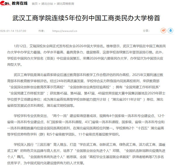 1月12日,艾瑞深校友会网正式发布校友会2026中国大学排名。榜单显示,武汉工商学院在中国工商类民办大学中办学实力最强、办学水平最高、最具竞争力,雄居榜首,这是学校连续第五年登顶该排行榜。此外,学校在中国民办大学排名(Ⅲ类)中位居全国第五,荣膺2026中国六星级民办大学,办学层次为中国顶尖应用型大学。