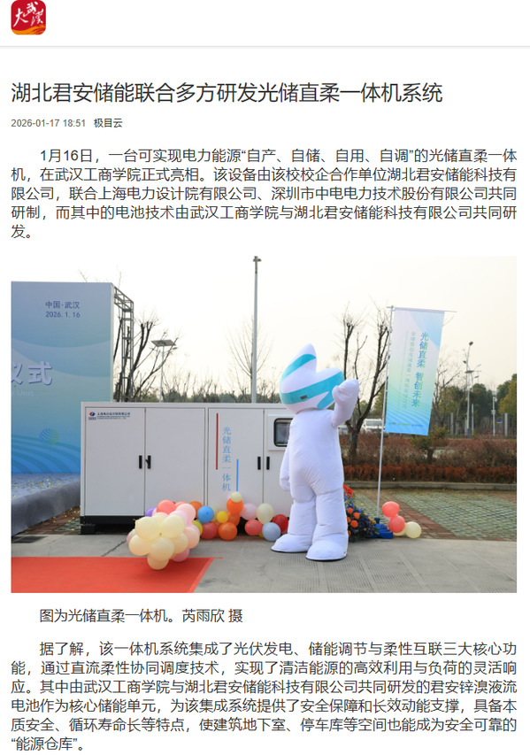 1月16日,一台可实现电力能源“自产、自储、自用、自调”的光储直柔一体机,在武汉工商学院正式亮相。该设备由该校校企合作单位湖北君安储能科技有限公司,联合上海电力设计院有限公司、深圳市中电电力技术股份有限公司共同研制,而其中的电池技术由武汉工商学院与湖北君安储能科技有限公司共同研发。