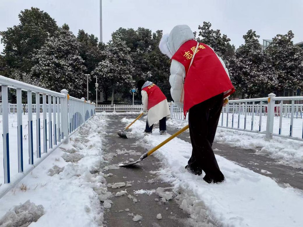 图为志愿者们正在除雪