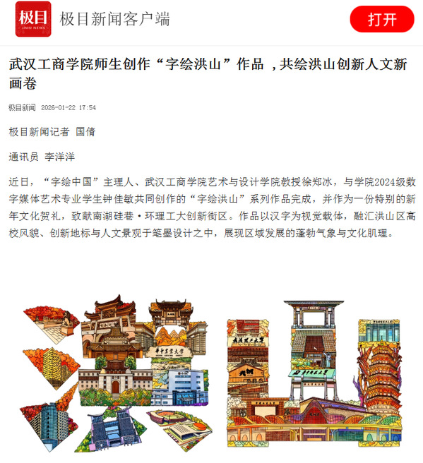 近日,“字绘中国”主理人、武汉工商学院艺术与设计学院教授徐郑冰,与学院2024级数字媒体艺术专业学生钟佳敏共同创作的“字绘洪山”系列作品完成,并作为一份特别的新年文化贺礼,致献南湖硅巷·环理工大创新街区。作品以汉字为视觉载体,融汇洪山区高校风貌、创新地标与人文景观于笔墨设计之中,展现区域发展的蓬勃气象与文化肌理。