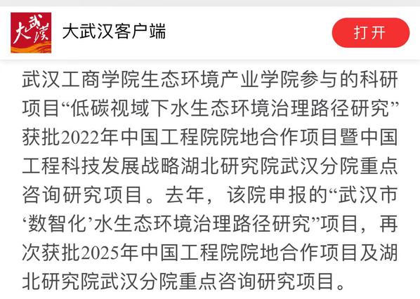 武汉工商学院生态环境产业学院参与的科研项目“低碳视域下水生态环境治理路径研究”获批2022年中国工程院院地合作项目暨中国工程科技发展战略湖北研究院武汉分院重点咨询研究项目。去年,该院申报的“武汉市‘数智化’水生态环境治理路径研究”项目,再次获批2025年中国工程院院地合作项目及湖北研究院武汉分院重点咨询研究项目。