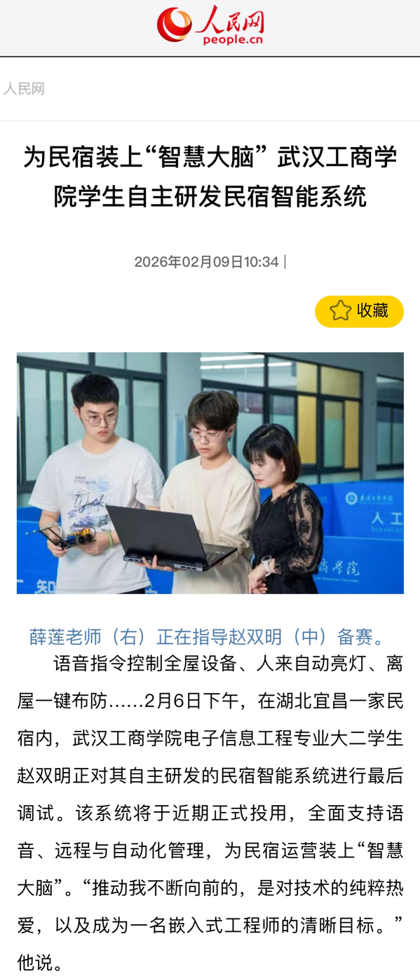 语音指令控制全屋设备、人来自动亮灯、离屋一键布防……2月6日下午,在湖北宜昌一家民宿内,武汉工商学院电子信息工程专业大二学生赵双明正对其自主研发的民宿智能系统进行最后调试。该系统将于近期正式投用,全面支持语音、远程与自动化管理,为民宿运营装上“智慧大脑”。“推动我不断向前的,是对技术的纯粹热爱,以及成为一名嵌入式工程师的清晰目标。”他说。