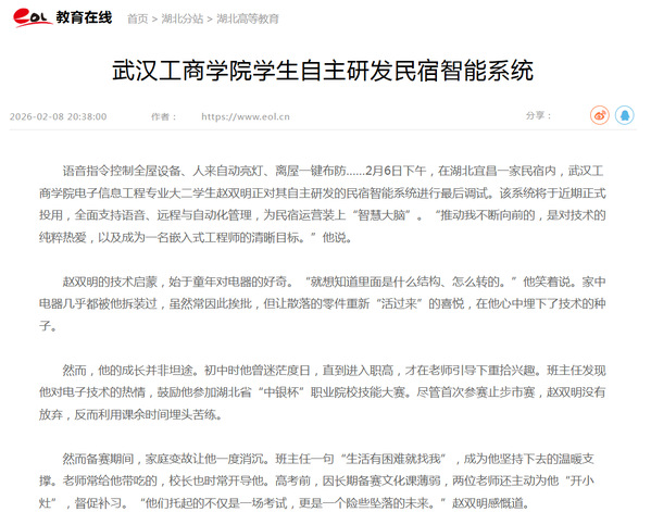 语音指令控制全屋设备、人来自动亮灯、离屋一键布防……2月6日下午,在湖北宜昌一家民宿内,武汉工商学院电子信息工程专业大二学生赵双明正对其自主研发的民宿智能系统进行最后调试。该系统将于近期正式投用,全面支持语音、远程与自动化管理,为民宿运营装上“智慧大脑”。“推动我不断向前的,是对技术的纯粹热爱,以及成为一名嵌入式工程师的清晰目标。”他说。