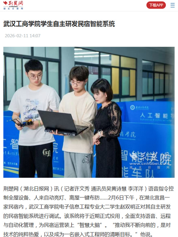荆楚网(湖北日报网)讯(记者许文秀 通讯员吴黄诗慧 李洋洋)语音指令控制全屋设备、人来自动亮灯、离屋一键布防……2月6日下午,在湖北宜昌一家民宿内,武汉工商学院电子信息工程专业大二学生赵双明正对其自主研发的民宿智能系统进行调试。该系统将于近期正式投用,全面支持语音、远程与自动化管理,为民宿运营装上“智慧大脑”。“推动我不断向前的,是对技术的纯粹热爱,以及成为一名嵌入式工程师的清晰目标。”他说。