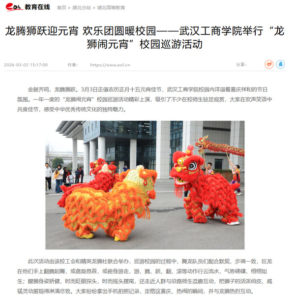 金鼓齐鸣,龙腾狮跃。3月3日正值农历正月十五元宵佳节,武汉工商学院校园内洋溢着喜庆祥和的节日氛围。一年一度的“龙狮闹元宵”校园巡游活动精彩上演,吸引了不少在校师生驻足观赏,大家在欢声笑语中共度佳节,感受中华优秀传统文化的独特魅力。