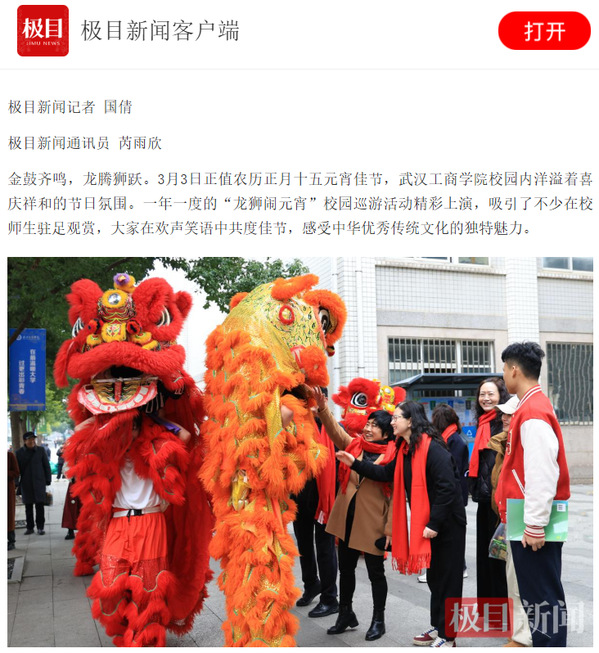 金鼓齐鸣,龙腾狮跃。3月3日正值农历正月十五元宵佳节,武汉工商学院校园内洋溢着喜庆祥和的节日氛围。一年一度的“龙狮闹元宵”校园巡游活动精彩上演,吸引了不少在校师生驻足观赏,大家在欢声笑语中共度佳节,感受中华优秀传统文化的独特魅力。