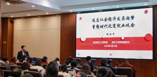 新闻中心讯(特约记者 周小莎)3月10日下午,由武汉工商学院招生与就业工作部主办的“适应社会经济发展趋势 重塑时代之变就业观念”专题讲座在图书馆0102报告厅举行。教育部全国高等学校就业创业指导委员会委员、创新创业教育专家、武汉工商学院副校长赵北平应邀担任主讲,各学院党总支书记、全体辅导员、大学生职业生涯规划与就业指导课程教师等百余人参加了本次讲座。