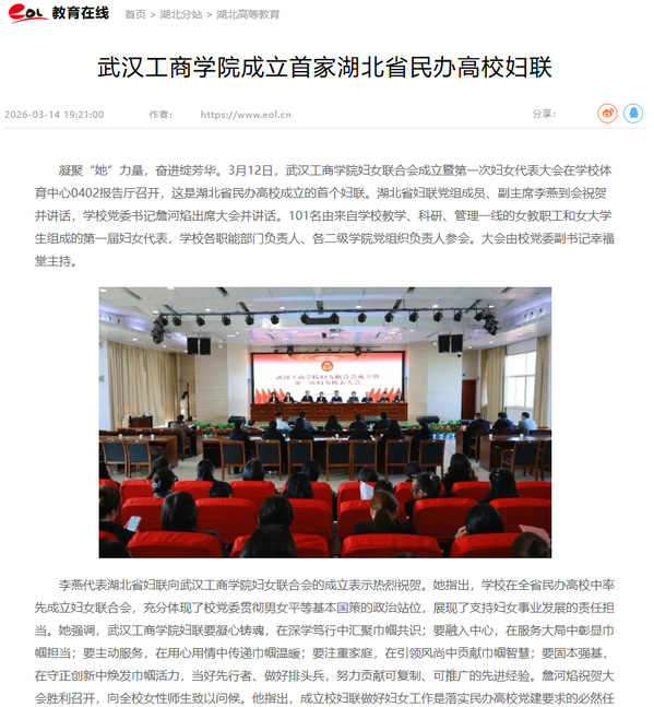 凝聚“她”力量,奋进绽芳华。3月12日,武汉工商学院妇女联合会成立暨第一次妇女代表大会在学校体育中心0402报告厅召开,这是湖北省民办高校成立的首个妇联。湖北省妇联党组成员、副主席李燕到会祝贺并讲话,学校党委书记詹河焰出席大会并讲话。101名由来自学校教学、科研、管理一线的女教职工和女大学生组成的第一届妇女代表,学校各职能部门负责人、各二级学院党组织负责人参会。大会由校党委副书记幸福堂主持。