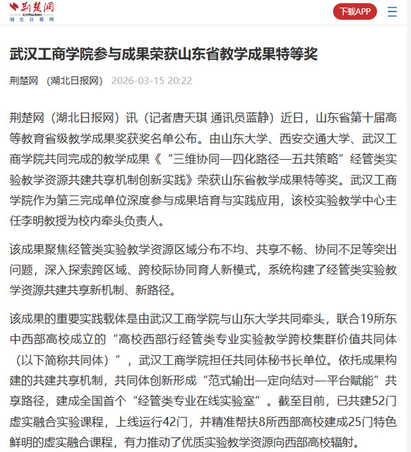 荆楚网(湖北日报网)讯(记者唐天琪 通讯员蓝静)近日,山东省第十届高等教育省级教学成果奖获奖名单公布。由山东大学、西安交通大学、武汉工商学院共同完成的教学成果《“三维协同—四化路径—五共策略”经管类实验教学资源共建共享机制创新实践》荣获山东省教学成果特等奖。武汉工商学院作为第三完成单位深度参与成果培育与实践应用,该校实验教学中心主任李明教授为校内牵头负责人。