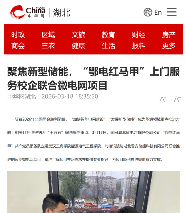 随着2026年全国两会胜利闭幕,“加快智能电网建设”“发展新型储能”成为能源领域重点推进方向,相关目标也被纳入“十五五”规划编制重点。3月17日,国网湖北省电力有限公司公司“鄂电红马甲”共产党员服务队走进武汉工商学院能源电气工程学院,对接该院与湖北君安储能科技有限公司联合推进的智能微电网项目,精准了解项目并网需求并提供专业指导,为项目顺利推进提供有力支撑。