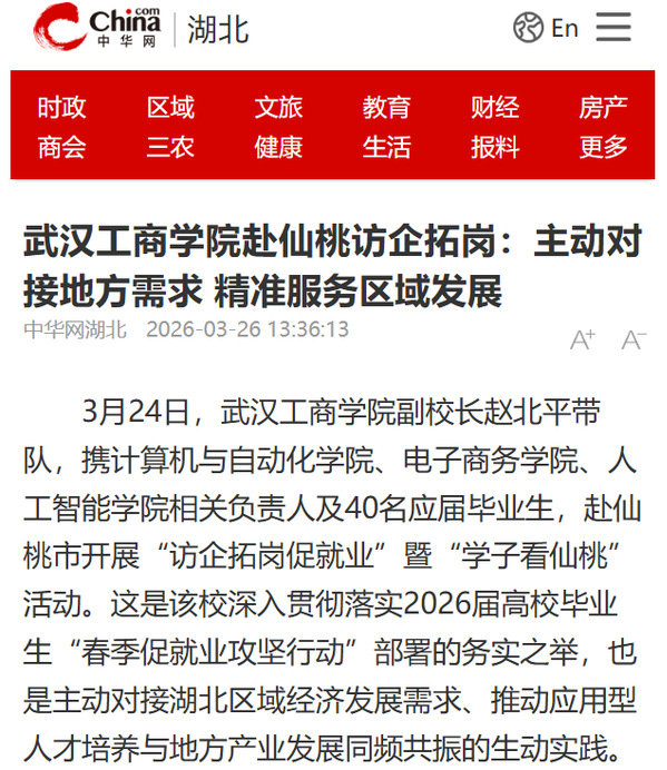 3月24日,武汉工商学院副校长赵北平带队,携计算机与自动化学院、电子商务学院、人工智能学院相关负责人及40名应届毕业生,赴仙桃市开展“访企拓岗促就业”暨“学子看仙桃”活动。这是该校深入贯彻落实2026届高校毕业生“春季促就业攻坚行动”部署的务实之举,也是主动对接湖北区域经济发展需求、推动应用型人才培养与地方产业发展同频共振的生动实践。