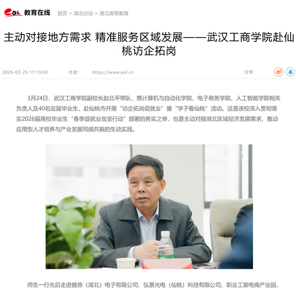 3月24日,武汉工商学院副校长赵北平带队,携计算机与自动化学院、电子商务学院、人工智能学院相关负责人及40名应届毕业生,赴仙桃市开展“访企拓岗促就业”暨“学子看仙桃”活动。这是该校深入贯彻落实2026届高校毕业生“春季促就业攻坚行动”部署的务实之举,也是主动对接湖北区域经济发展需求、推动应用型人才培养与产业发展同频共振的生动实践。