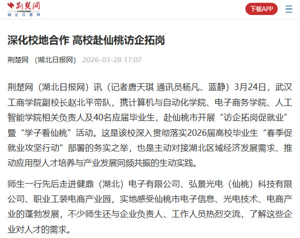 荆楚网(湖北日报网)讯(记者唐天琪 通讯员杨凡、蓝静)3月24日,武汉工商学院副校长赵北平带队,携计算机与自动化学院、电子商务学院、人工智能学院相关负责人及40名应届毕业生,赴仙桃市开展“访企拓岗促就业”暨“学子看仙桃”活动。这是该校深入贯彻落实2026届高校毕业生“春季促就业攻坚行动”部署的务实之举,也是主动对接湖北区域经济发展需求、推动应用型人才培养与产业发展同频共振的生动实践。